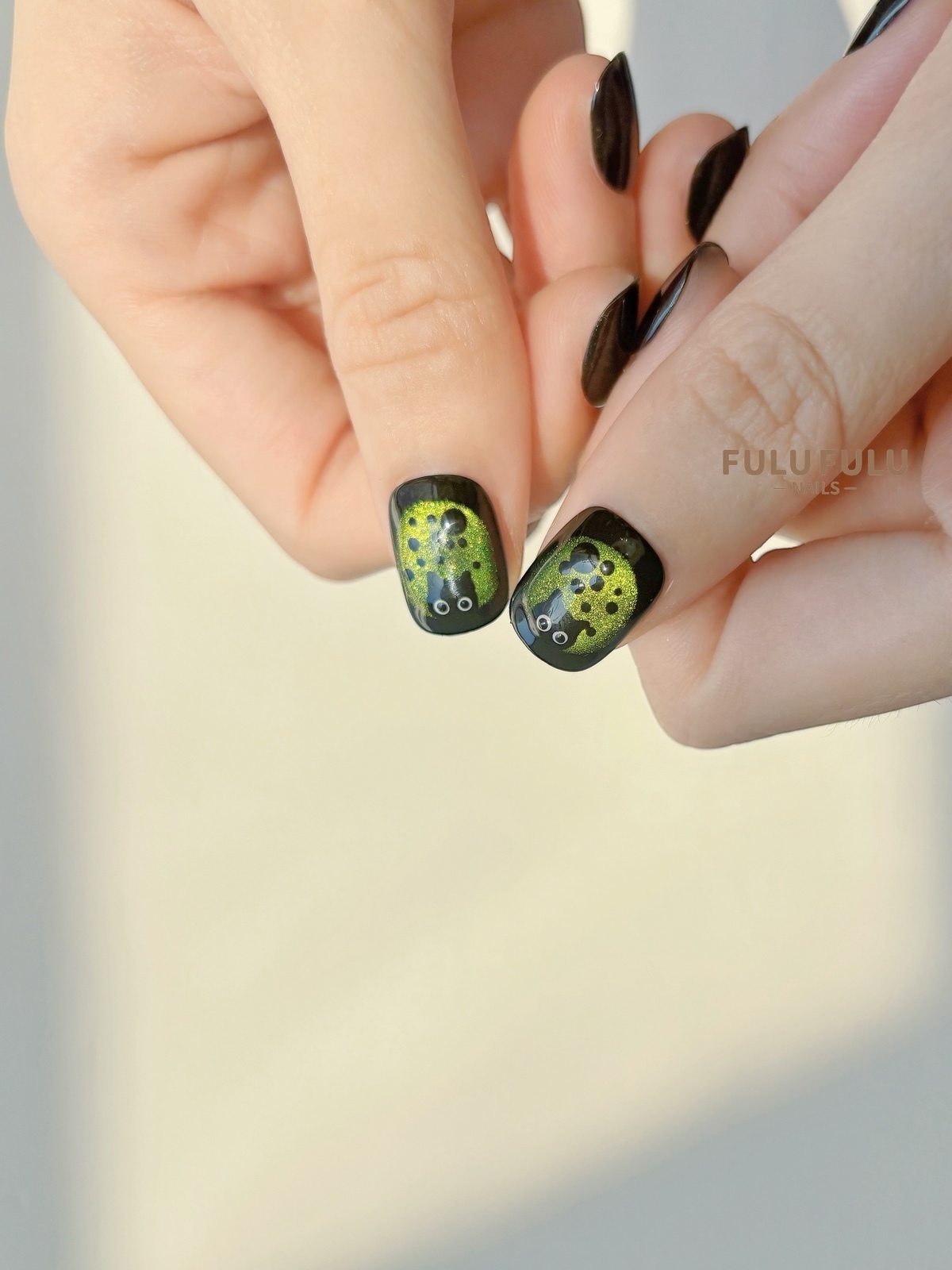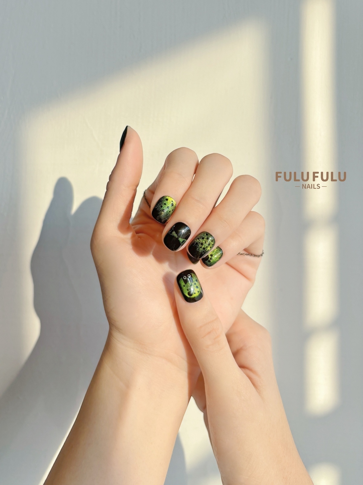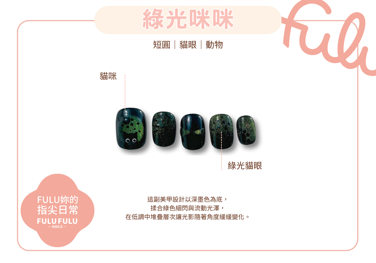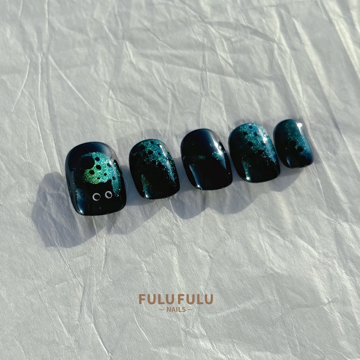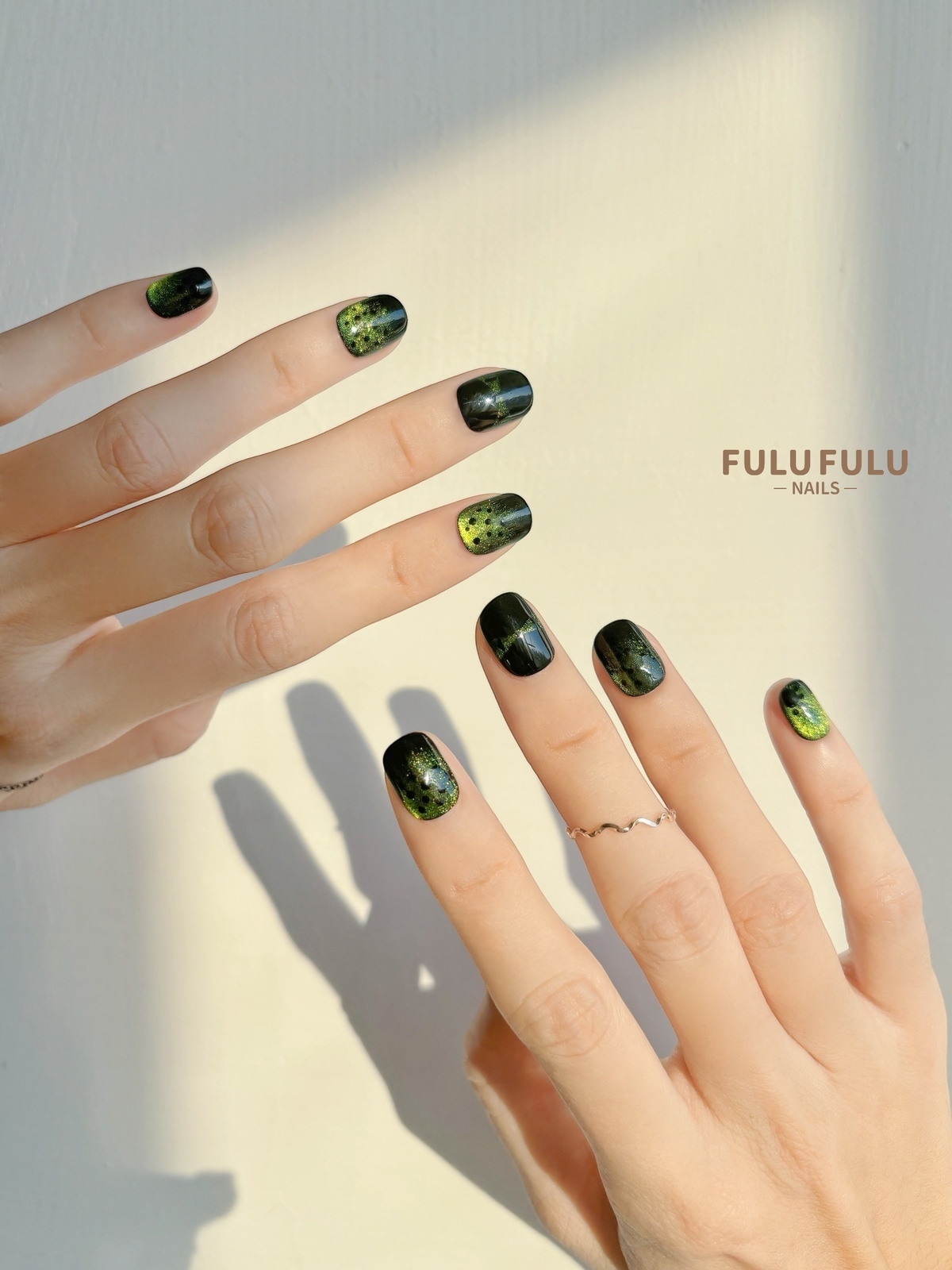 以深墨色為底,揉合綠色細閃與流動光澤,