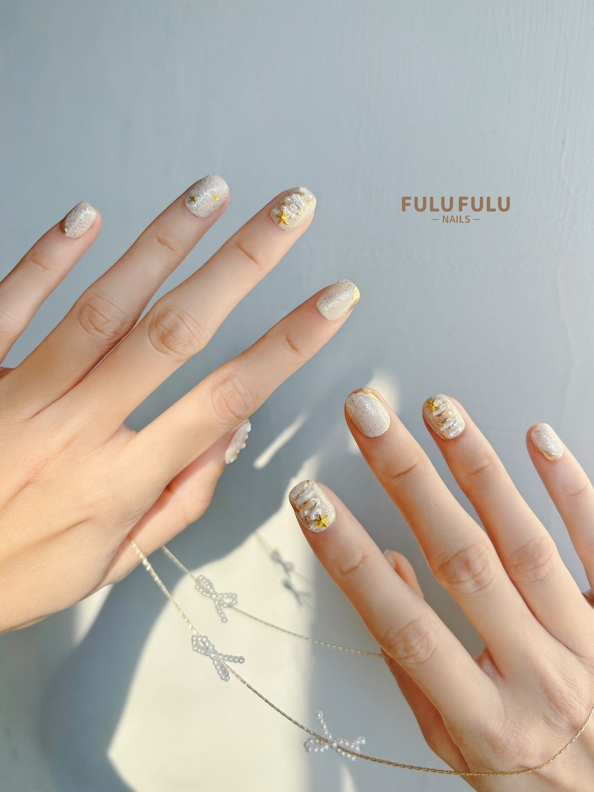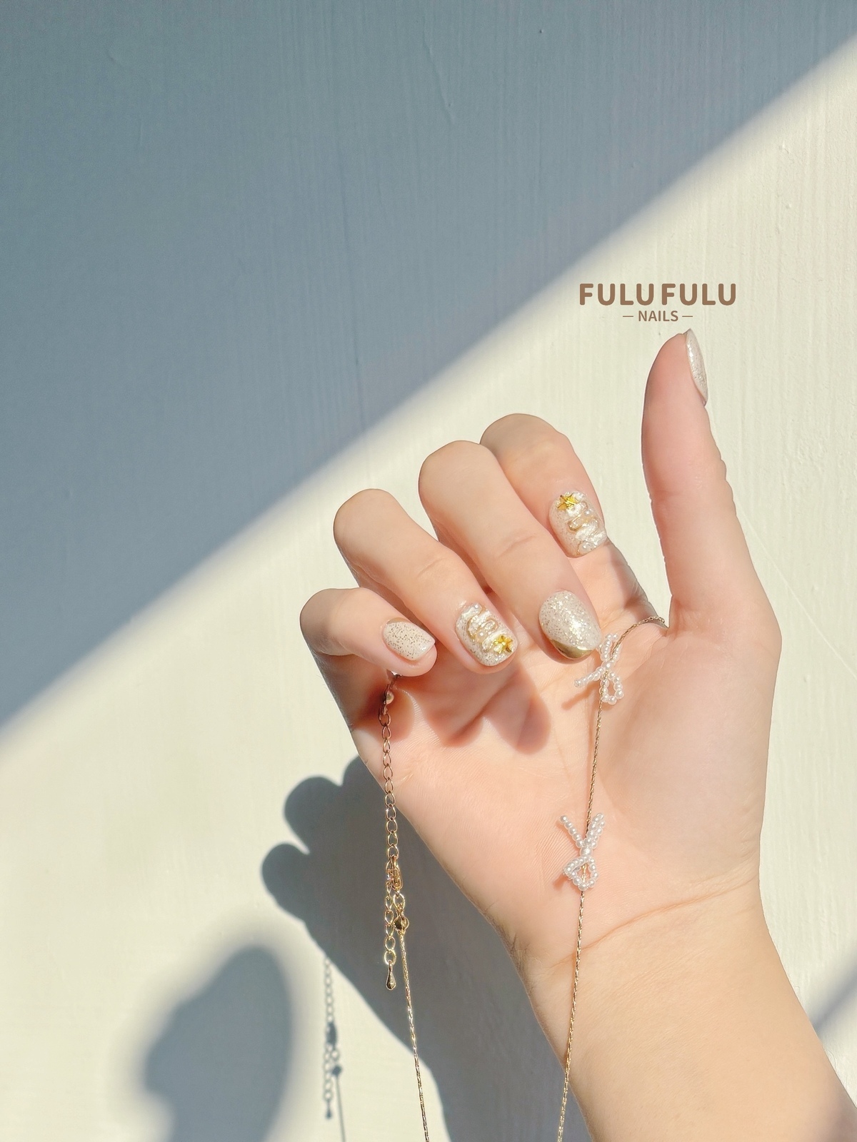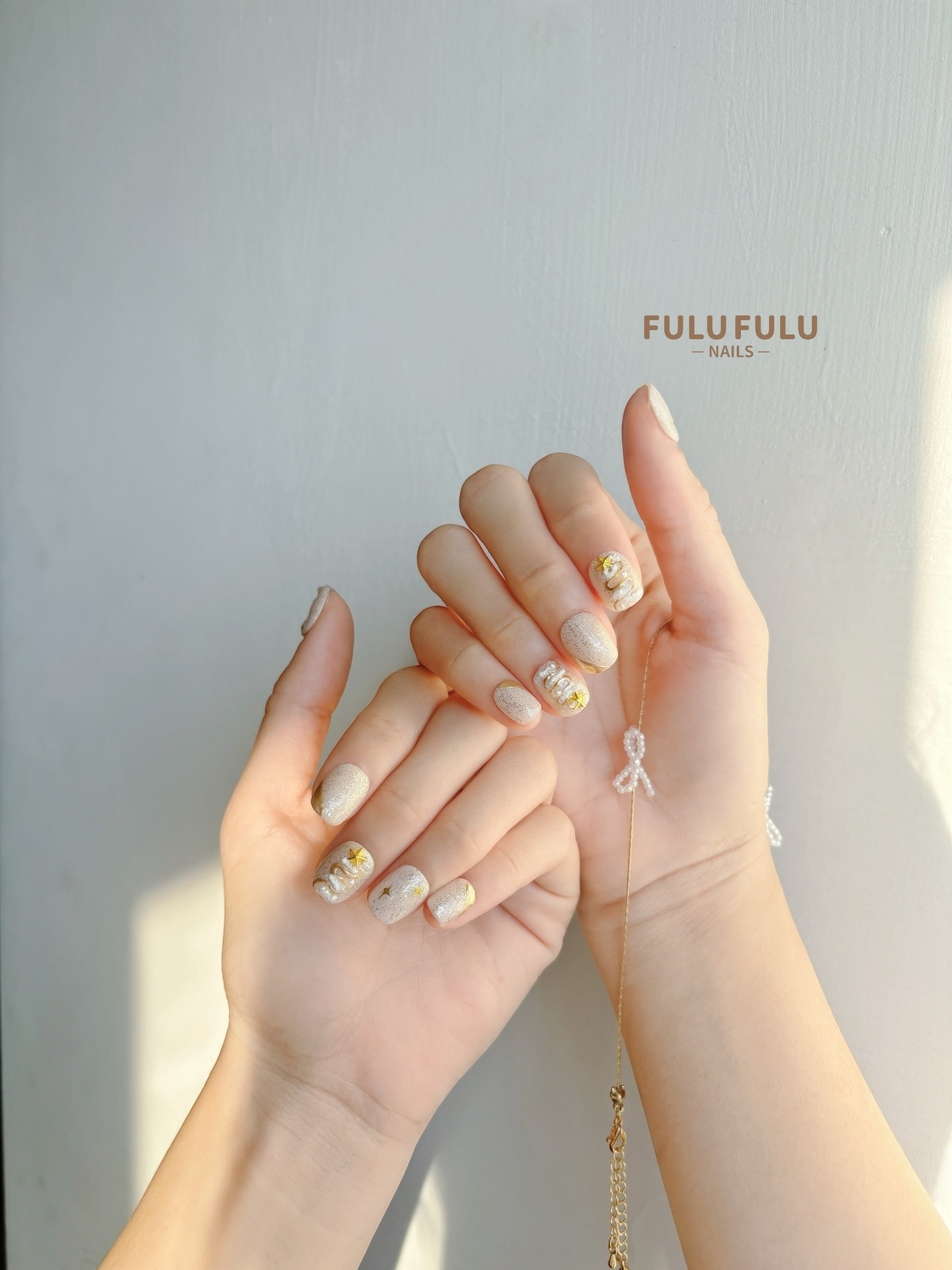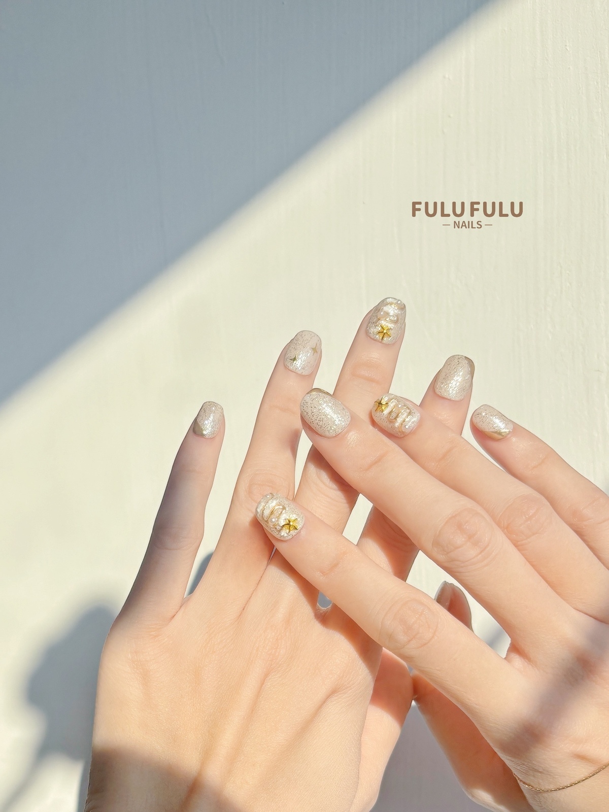 柔霧杏色為底,撒上細緻雪光亮粉,