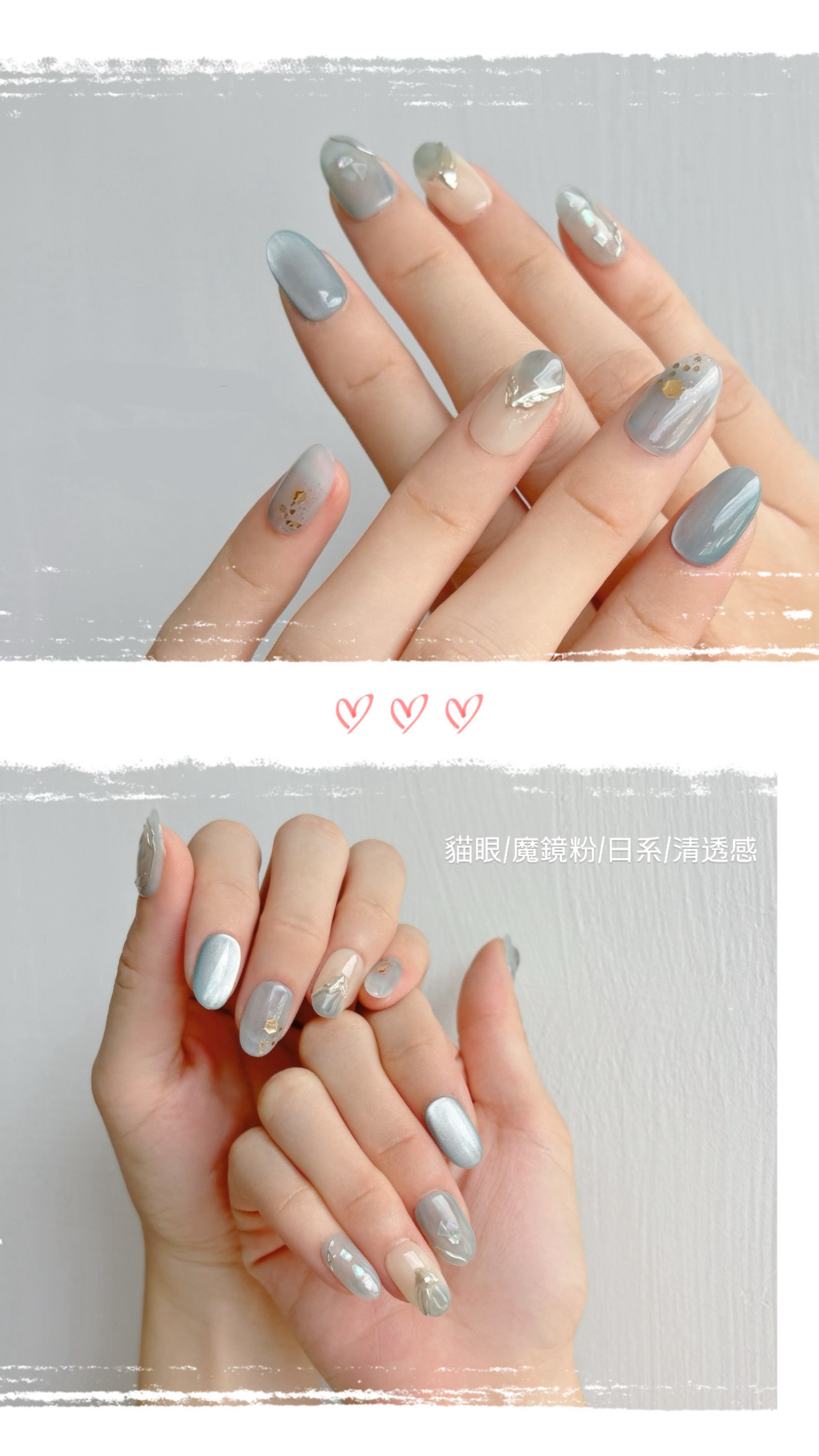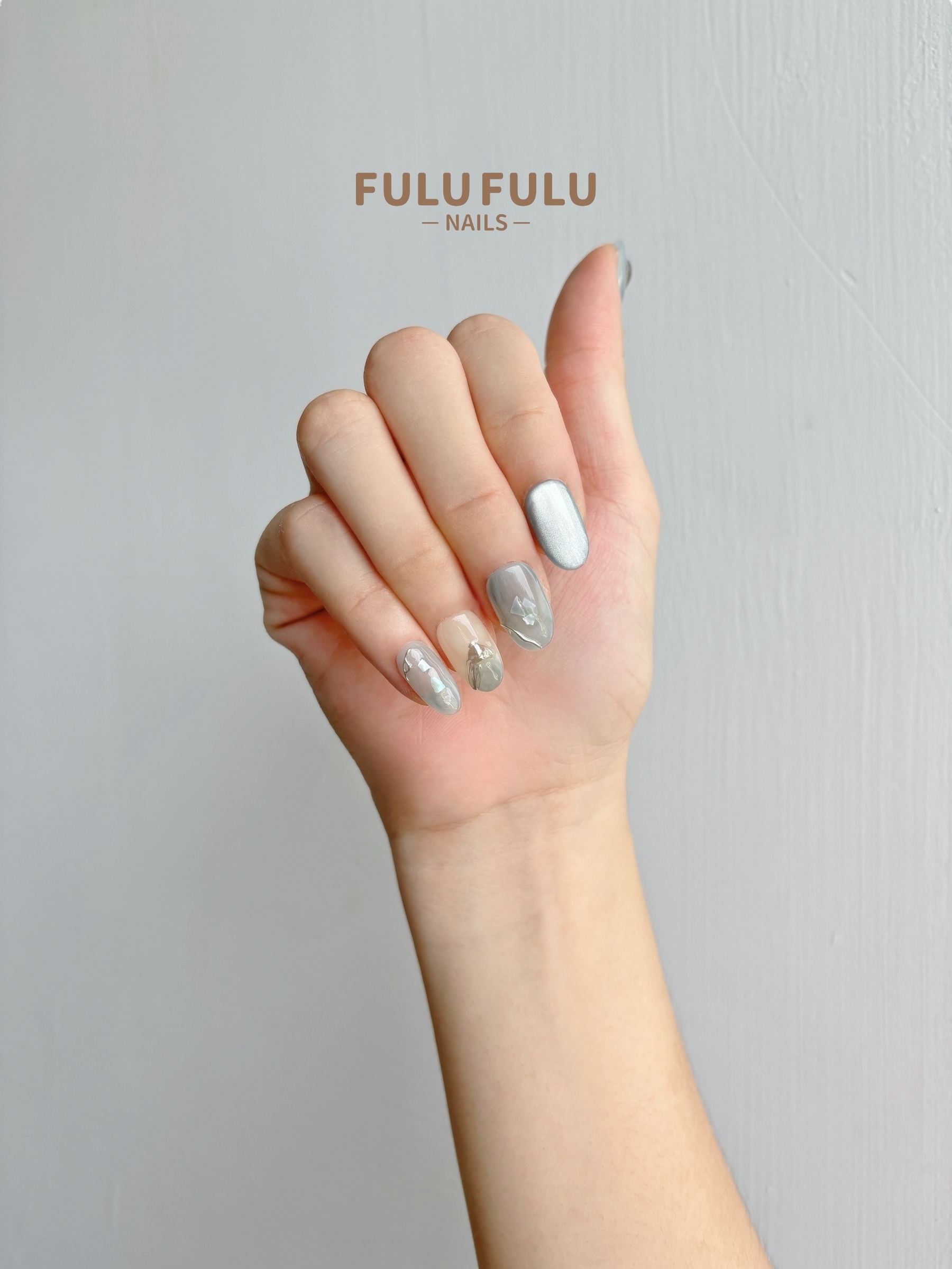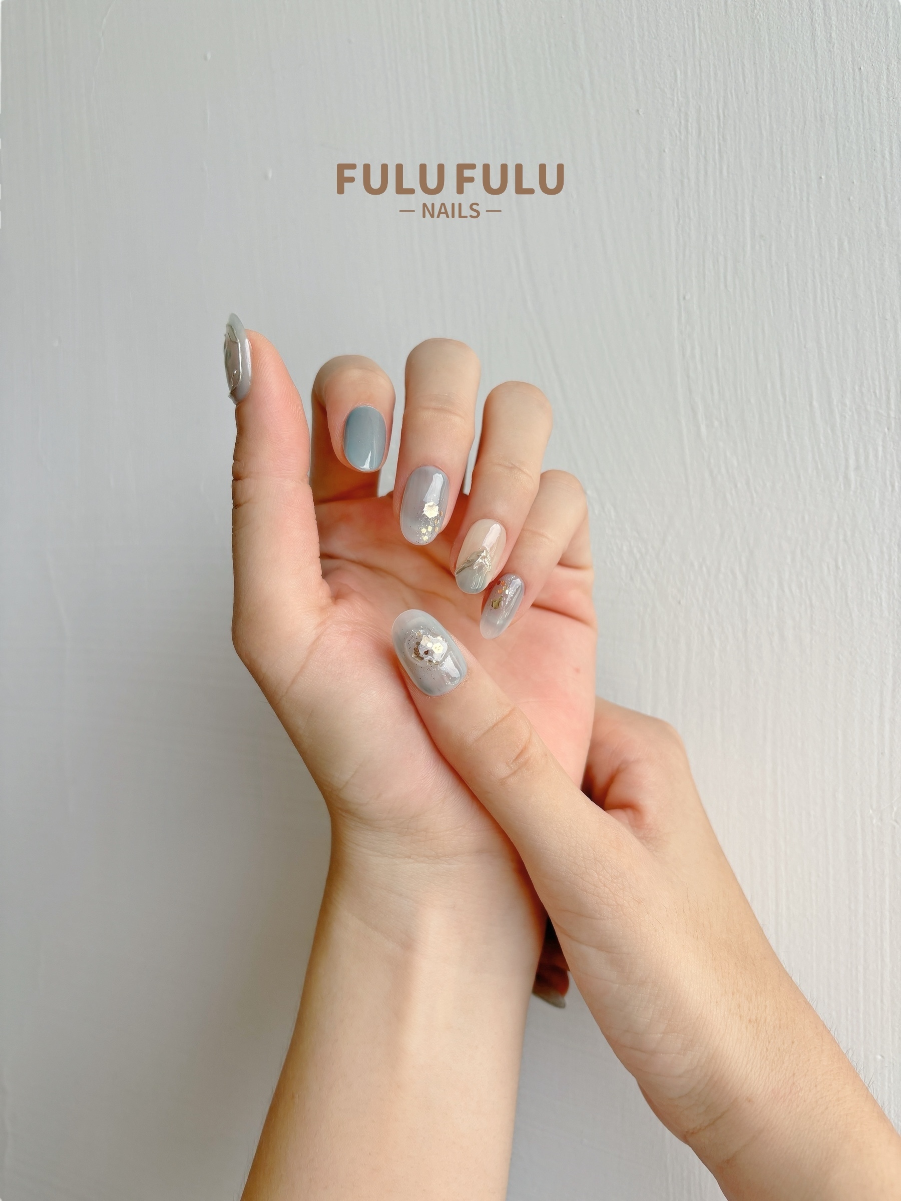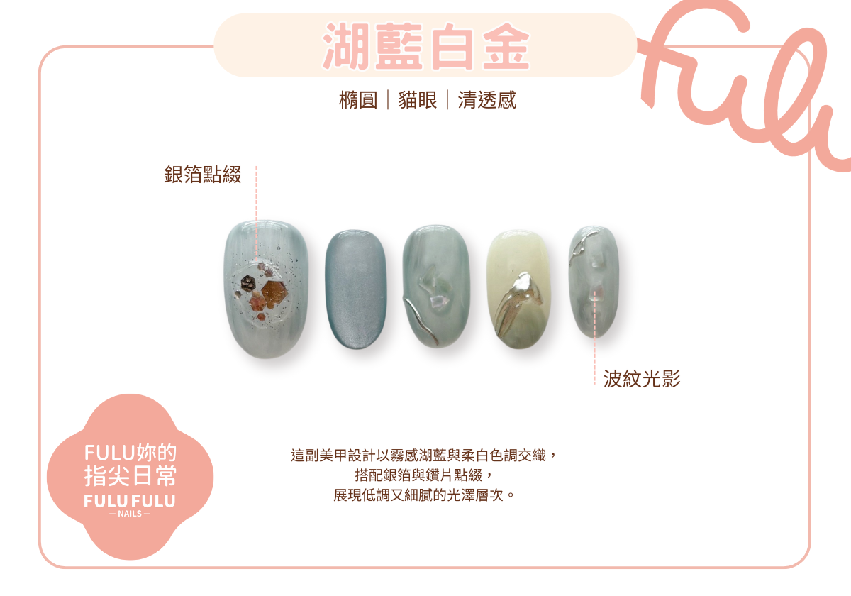 以霧感湖藍與柔白色調交織,搭配銀箔與鑽片點綴,展現低調又細膩的光澤層次。