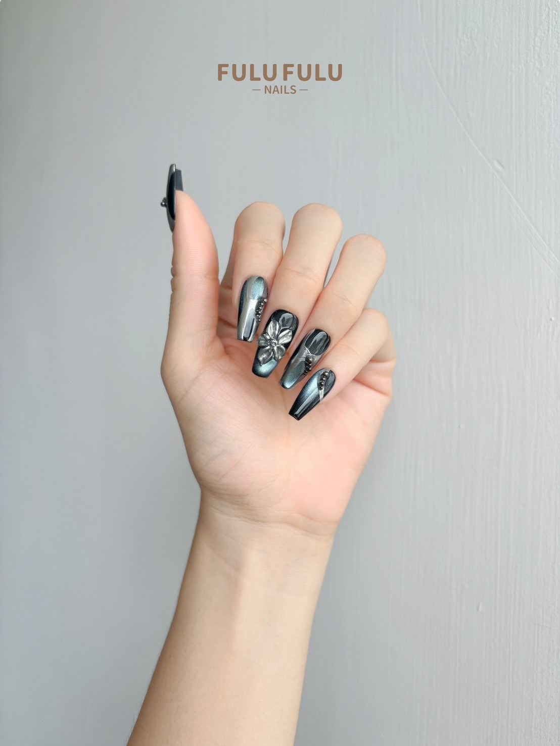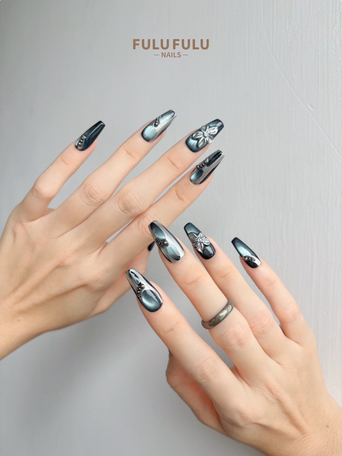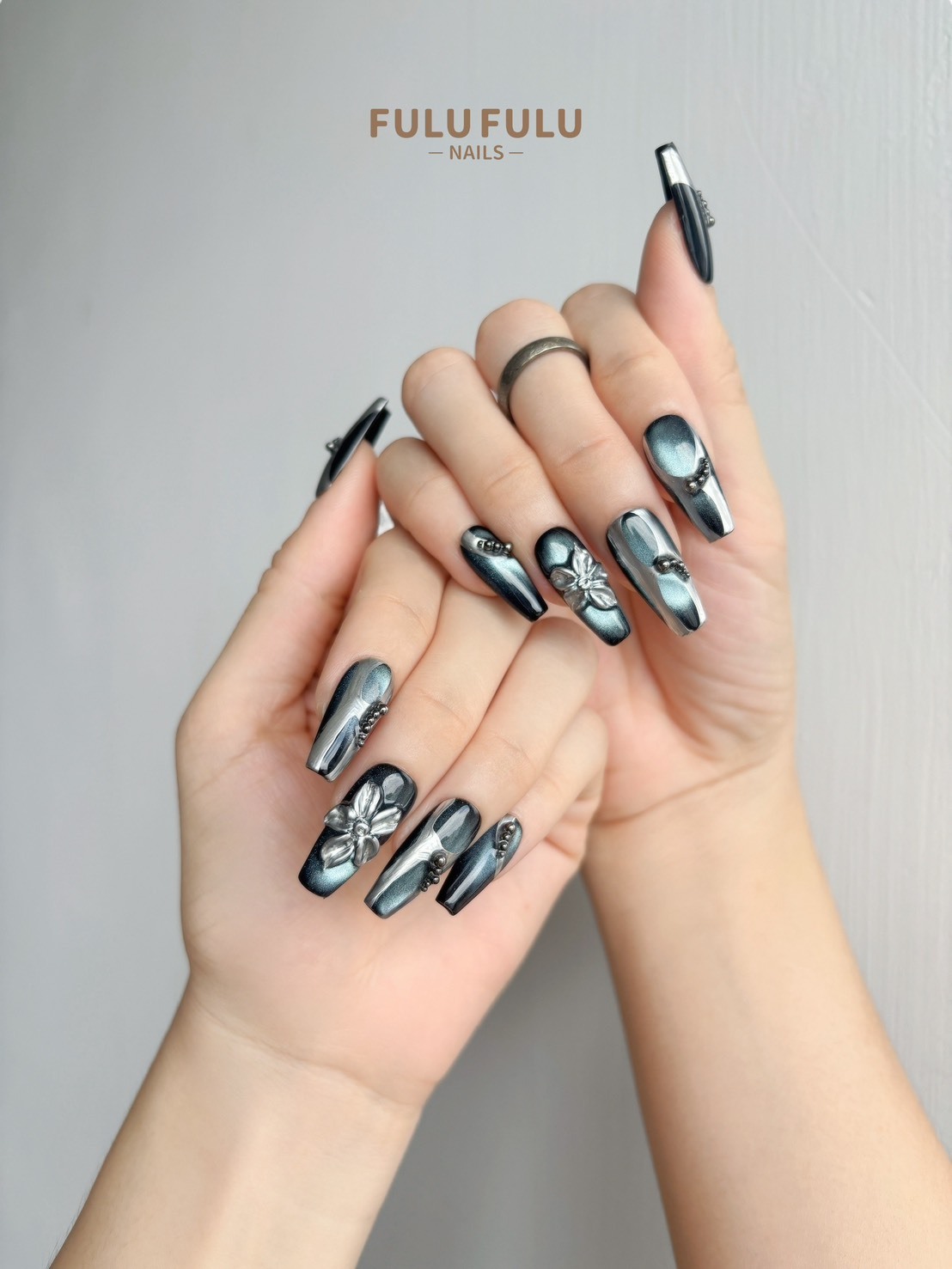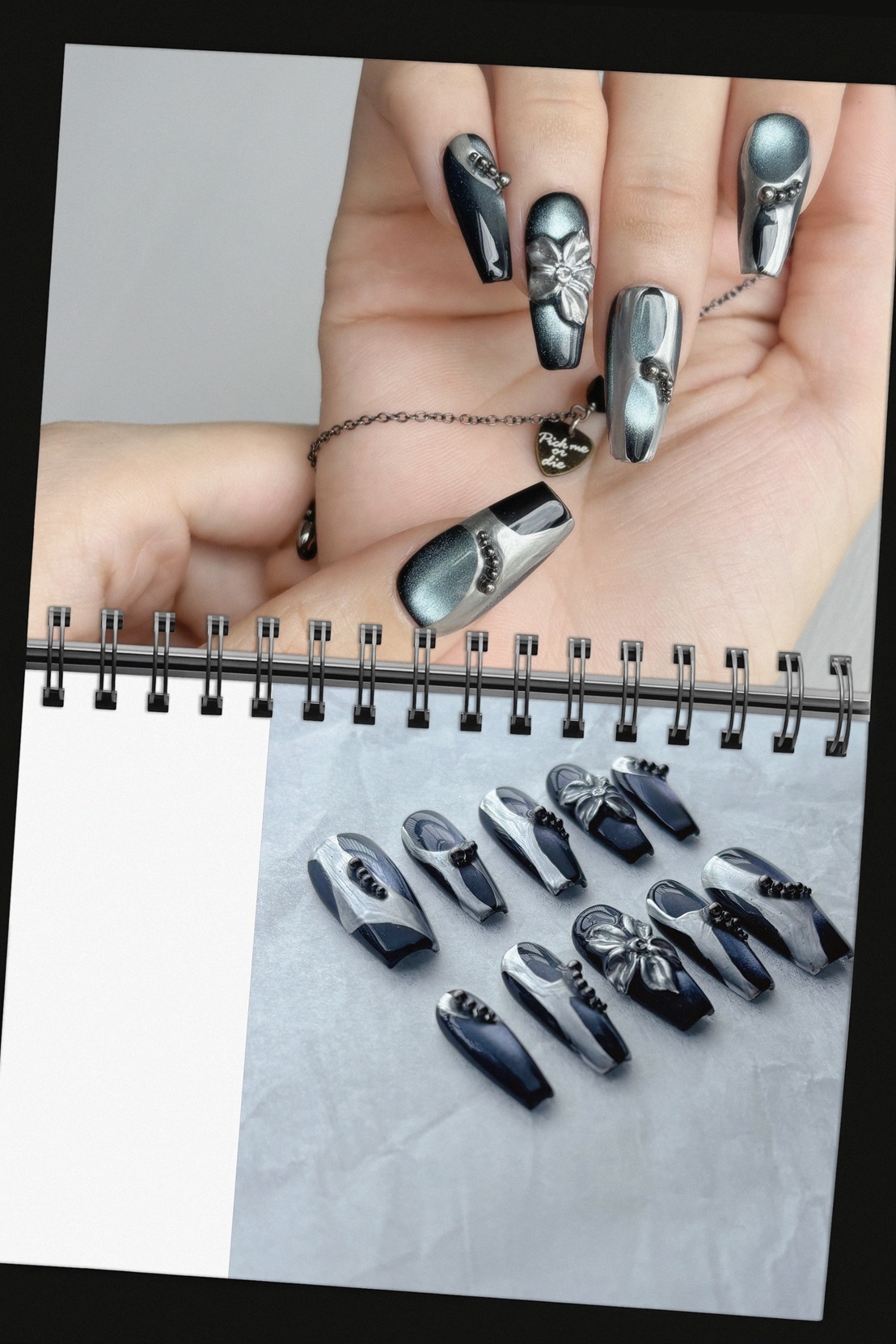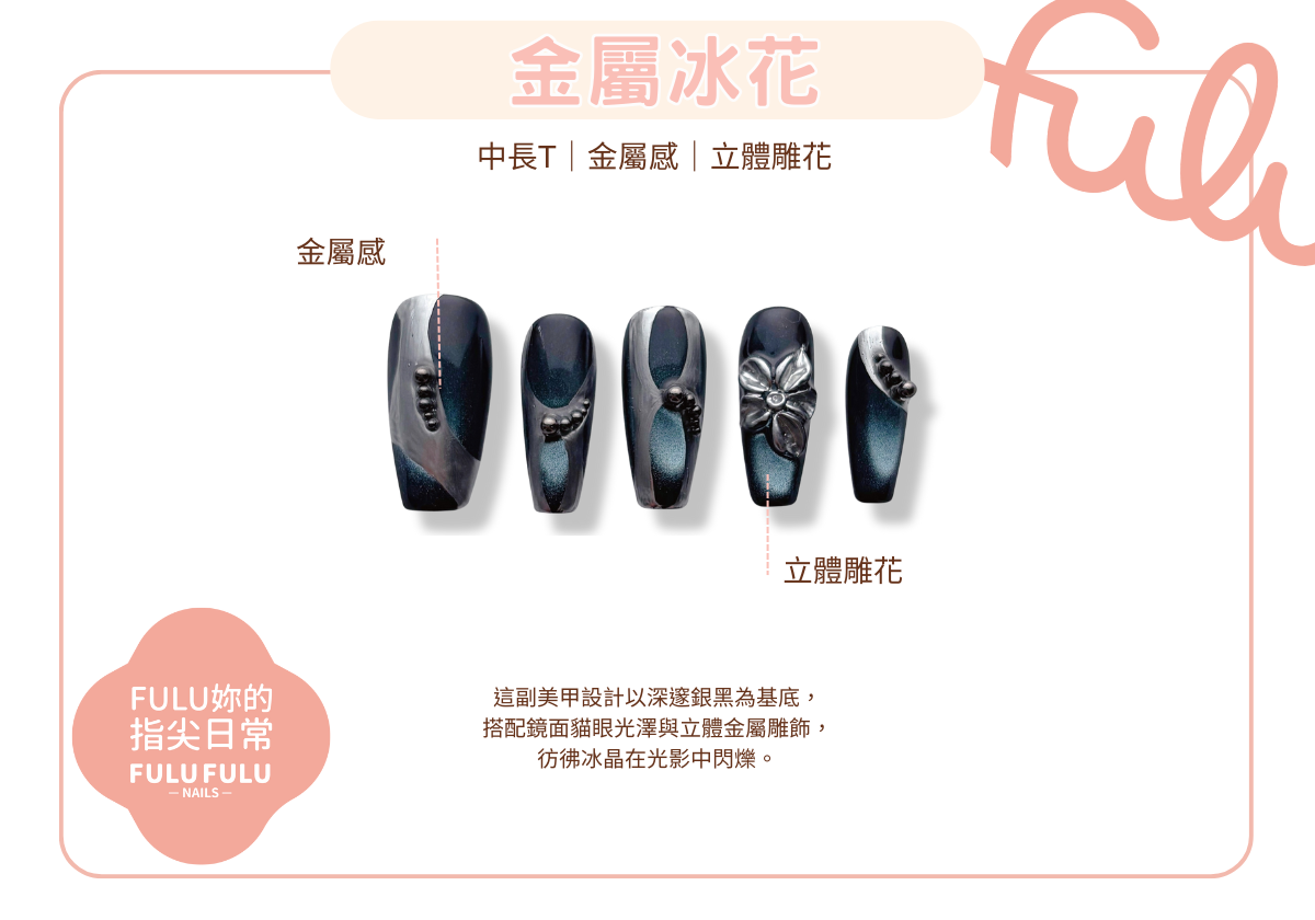 以深邃銀黑為基底,搭配鏡面貓眼光澤與立體金屬雕飾,彷彿冰晶在光影中閃爍。