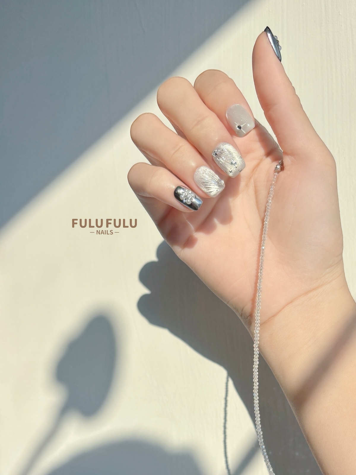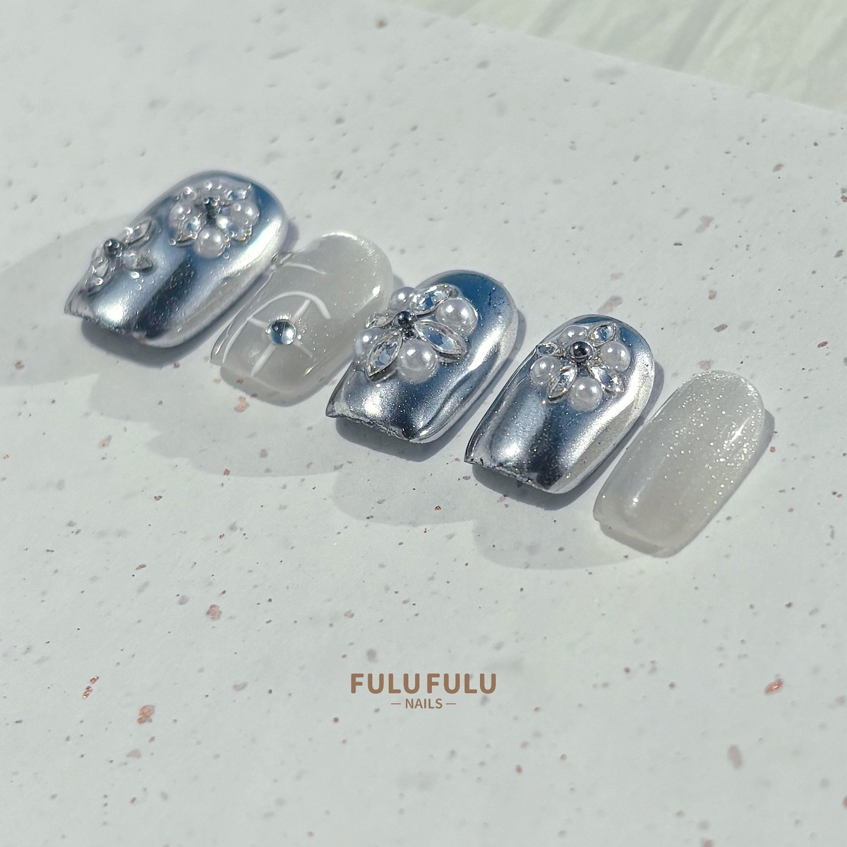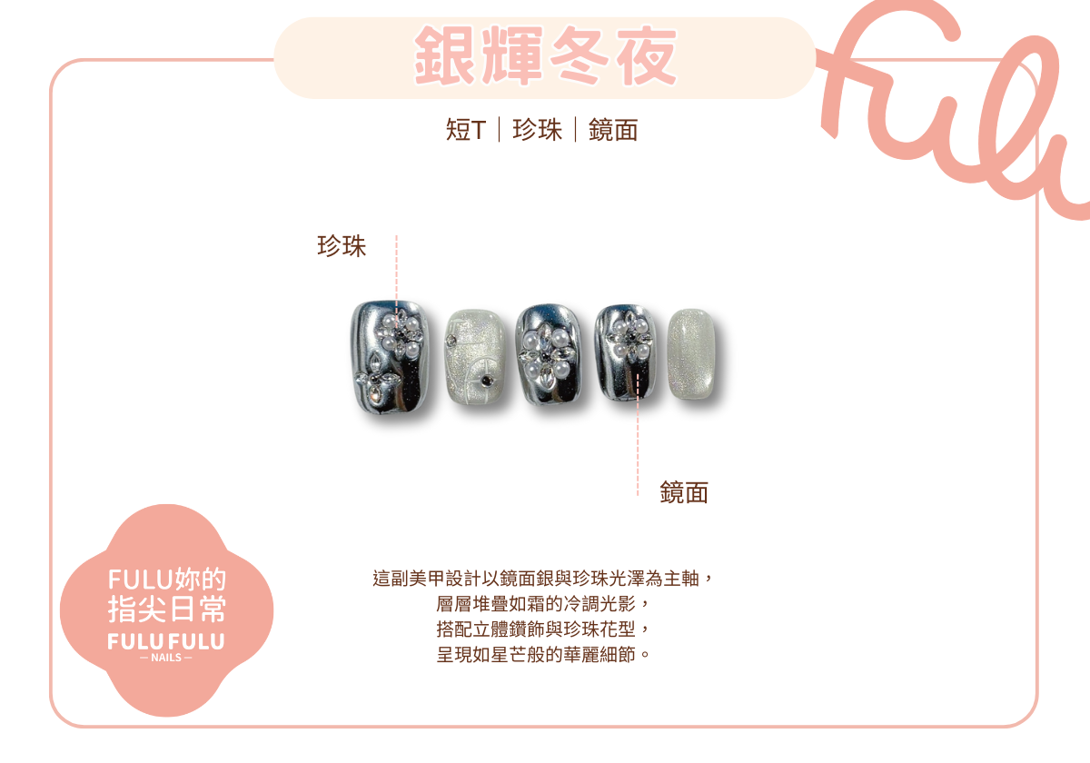 以鏡面銀與珍珠光澤為主,層層堆疊如霜的冷調光影,
