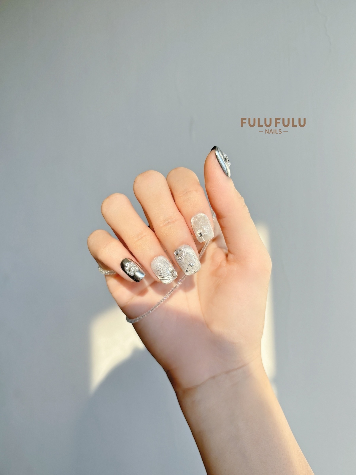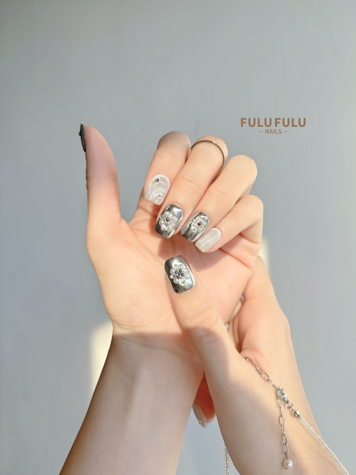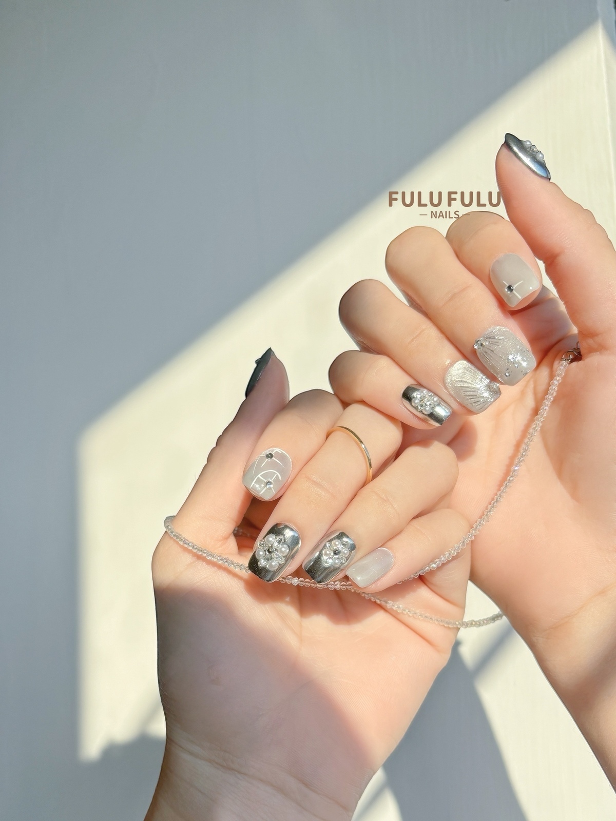 以鏡面銀與珍珠光澤為主,層層堆疊如霜的冷調光影,